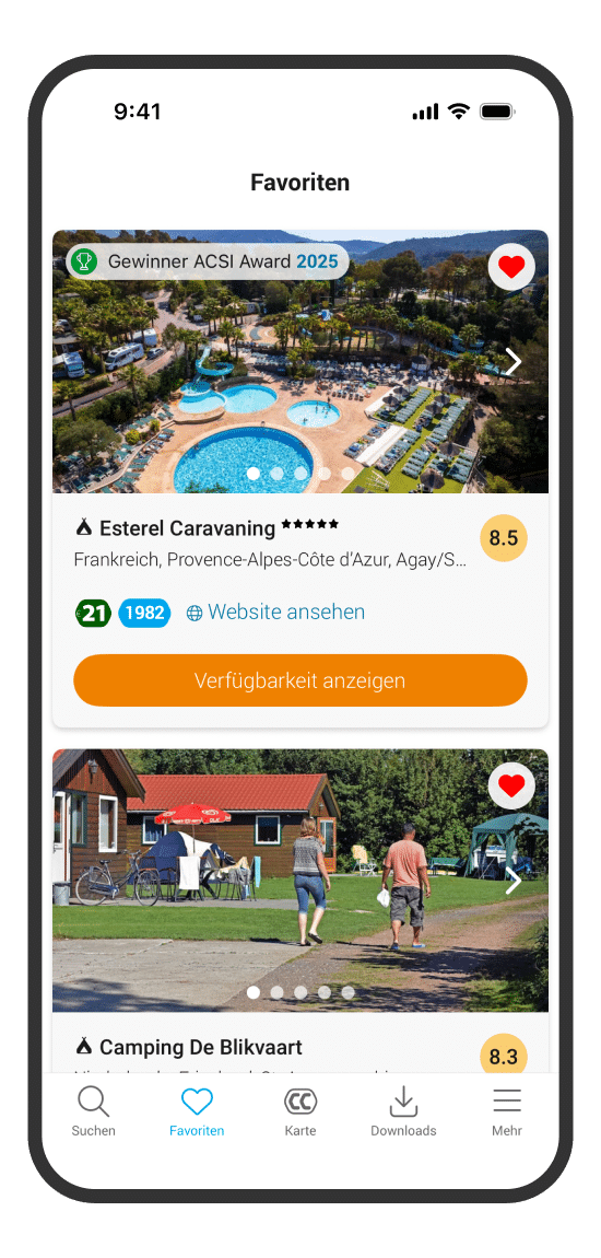 Sie können einen Camping- oder Wohnmobilplatz unter Ihren Favoriten speichern. So stellen Sie nach und nach e… Weiterlesenine Liste der Orte zusammen, die für Sie interessant sind. Es ist ganz einfach: Wenn Sie auf einer Webseite oben rechts das Herz anklicken, wird der Camping- oder Wohnmobilplatz Ihrer Liste hinzugefügt. Über das Menü können Sie die Liste unter „Favoriten“ jederzeit aufrufen. Text verbergen
