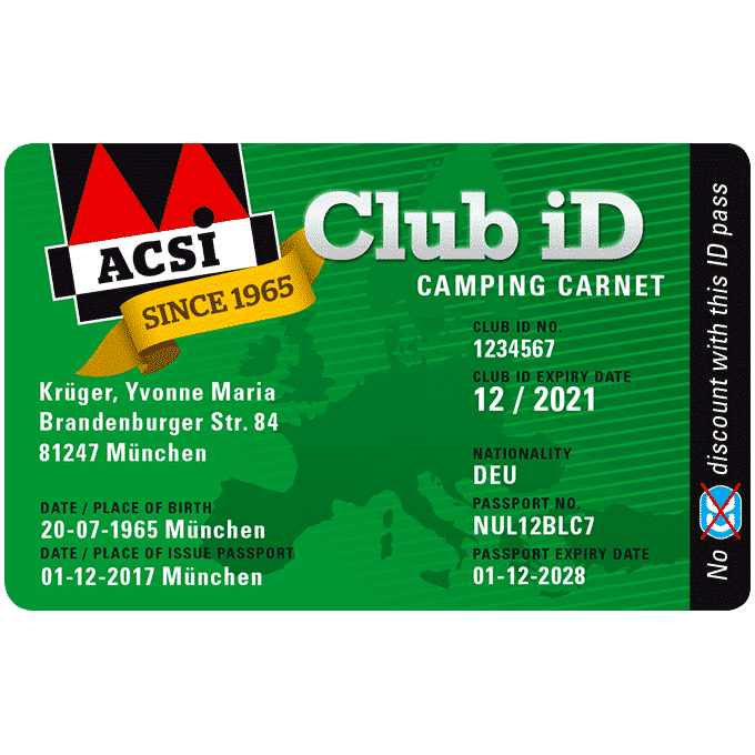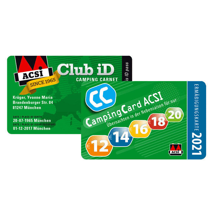 Mit einer Mitgliedschaft der ACSI Club ID, der praktischen ACSI Clubkarte, können Sie Ihren Reisepass sicher in Ihrer Tasche verwahren. Nahezu 8.800 Campingplätze in Europa akzeptieren die Clubkarte als Ausweisersatz. Darüber hinaus sind Sie automatisch haftpflichtversichert. Nicht nur auf einem Campingplatz, sondern auch bei der Unterbringung in einer Mietunterkunft oder einem Hotel. Und das ist noch nicht alles: ACSI-Club-ID-Mitglieder profitieren zudem von Sonderrabatten in unserem Webshop.