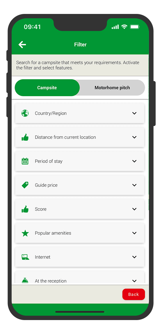 Set filters easily and find a campsite or motorhome pitch that meets your requirements. More and more campsite… Read mores allow you to reserve your spot directly through the app. Hide text