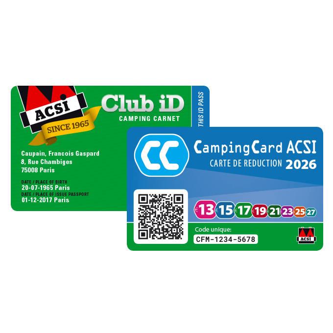 Presque 8 000 campings en Europe acceptent le passe comme pièce d’identité. En outre, vous bénéficiez automatiquement d’une assurance responsabilité civile. Pas seulement au camping, mais aussi lors de votre séjour en hébergement de location ou à l’hôtel. Ce n’est pays pas tout : les membres ACSI Club ID bénéficient de réductions spéciales dans notre boutique en ligne.