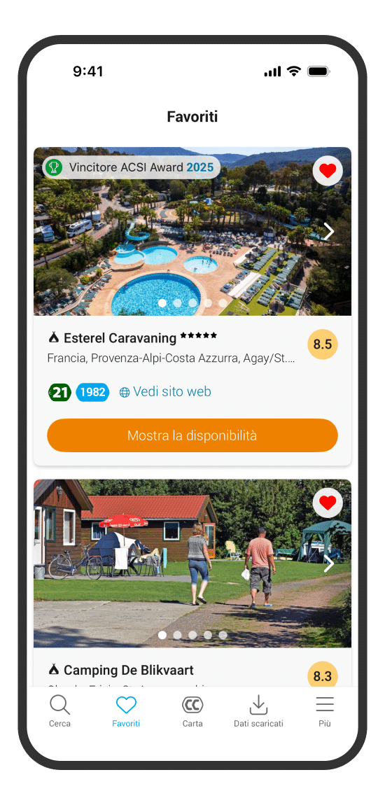 Puoi aggiungere un campeggio o una piazzola per il camper ai tuoi preferiti. Puoi creare una lista di luoghi c… Continuahe trovi interessanti. È molto semplice: premi il cuore che vedi in alto a sinistra della pagina e il campeggio o la piazzola per il camper vengono aggiunti. Alla voce “Preferiti” del menù puoi scorrere in fretta la tua lista. Nascondi testo